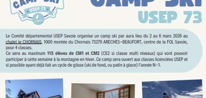 Camp Ski USEP du 02 au 06 mars 2026 au centre le Chornais à Arêches. Le Comité départemental USEP Savoie